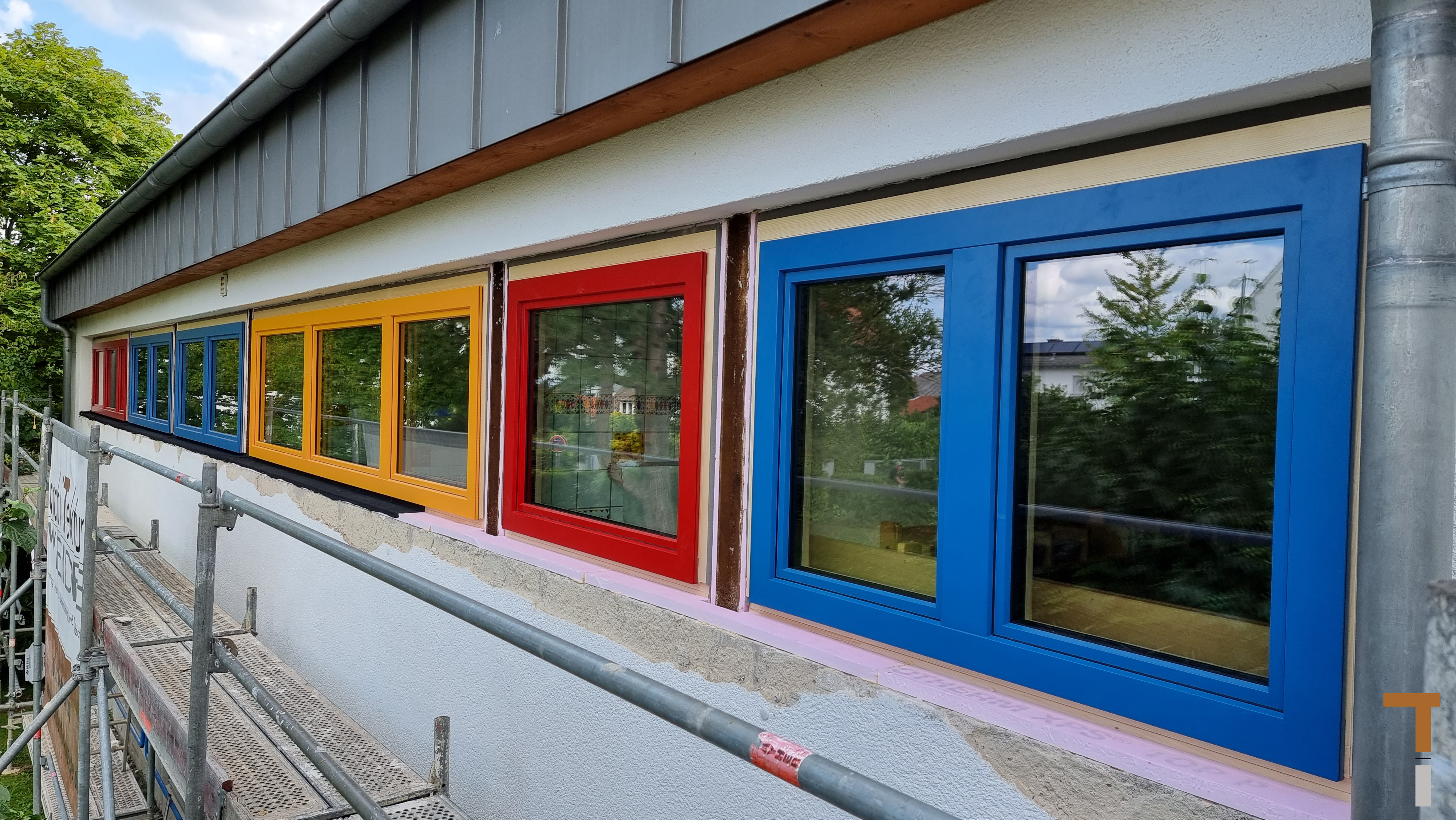 Das allseits vorhandene Brilliantblau wird ergänzt um Karminrot und Sonnengelb. Die Eingangsfassade der Evangelischen Kindertagesstätte der Markusgemeinde Butzbach in der Schillerstraße bekommt eine erfrischende, kindgerecht farbenfrohe Gestaltung im Zuge einer Fenstererneuerung. Dabei kommt es wie immer im Betand auf die Details an. Näheres beim Projekt Fenstererneuerung Kindertagesstätte.